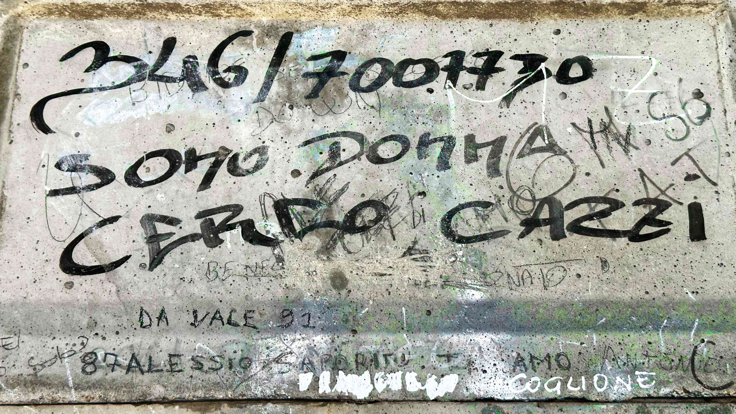Colgo qua e là delle date di iscrizione dei graffiti, la più recente è del 2024, ma è davvero l’unica. Un quindici anni prima era tutt’altra musica, una pioggia quotidiana di parole e segni che sgomitavano per trovare spazio. Sembrerebbe quindi che gli studenti odierni abbiamo smesso di utilizzare il muro – o lo facciano molto meno –  per manifestare le loro passioni. Colpa forse del cellulare a tempo pieno.