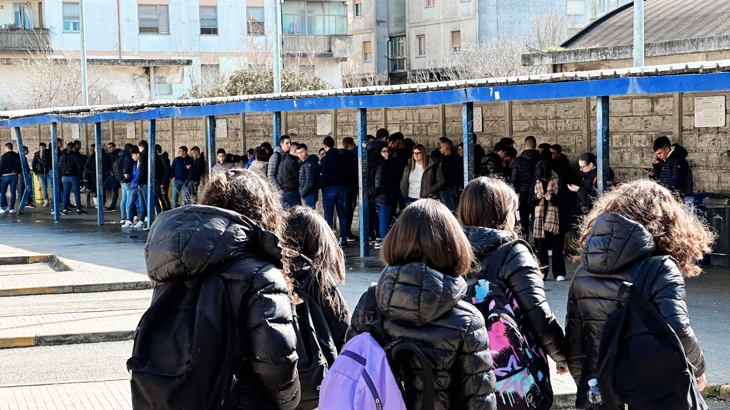 Sono quasi le due del pomeriggio, gli studenti pendolari delle scuole superiori giungono a passo lesto alla stazione, da soli o in piccoli gruppi. Si assembrano vocianti schierandosi lungo il muro. La sala d’attesa, che era dotata di un bar interno, è chiusa da diversi anni e non può più accoglierli. Alcuni montano sulle panchine di ferro poste sul marciapiede che costeggia la parete. Tutti con lo smartphone in mano, lo zaino sulle spalle, le scarpe di gomma. Se ne stanno sotto una pensilina mezzo sgangherata che li ripara dal sole o dalla pioggia, aspettando i pullman blu dell’Arst che li riportano ai loro paesi di provenienza.