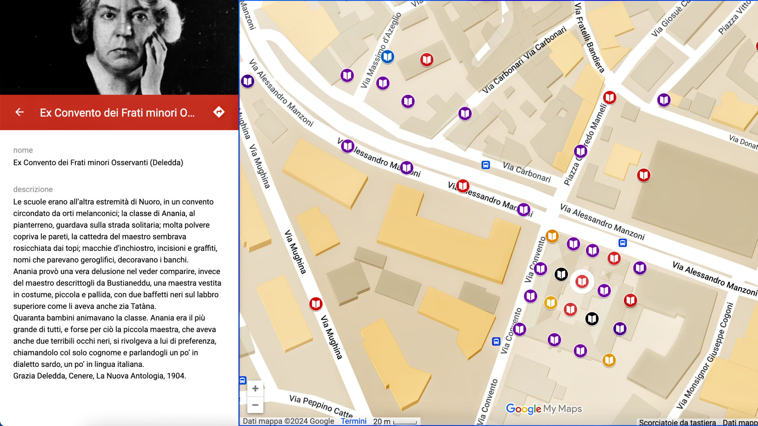Mappa Letteraria Nuoro è qui. Oppure qui, una via preferibile che porta al sito dedicato arricchito da altri contenuti. La mappa è tutta fatta di citazioni letterarie geolocalizzate, connesse cioè a luoghi puntuali della carta digitale Google My Maps della città. Citazioni riprese dalle opere di autori di ogni epoca, sardi e non, che contengono riferimenti a luoghi precisi e identificabili di Nuoro. Una via, una piazza, una chiesa, un toponimo, e così via. Ecco come appare la mappa.